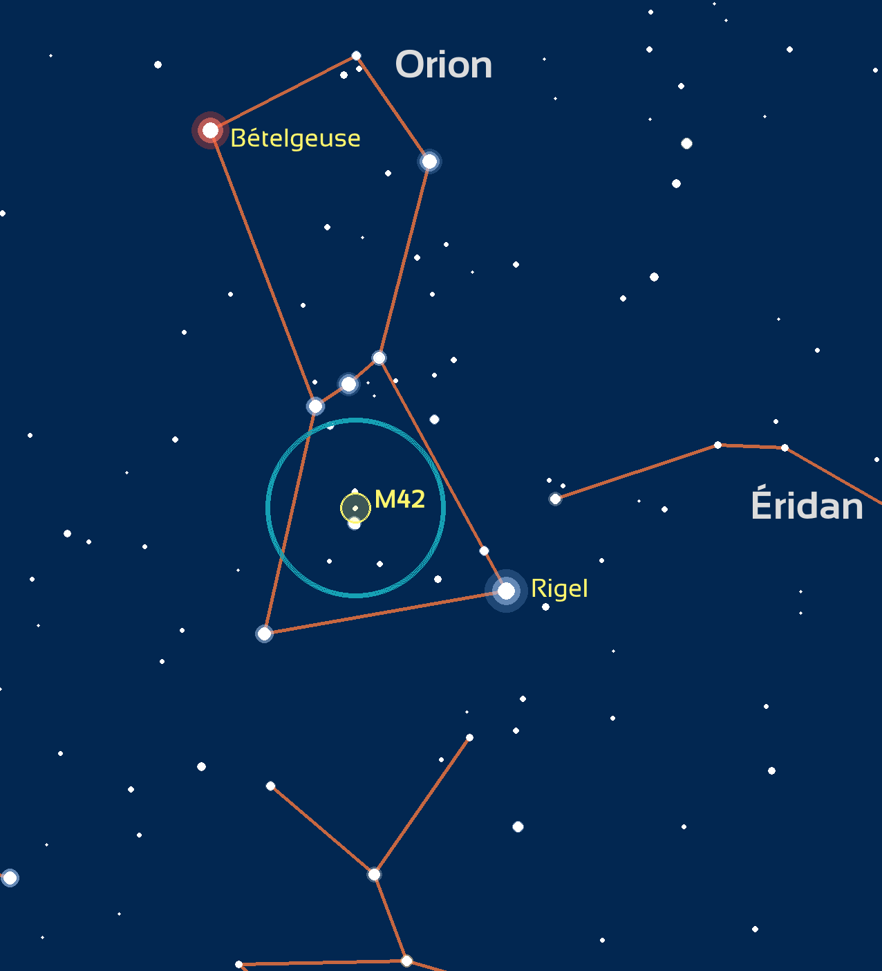 La nébuleuse d'Orion, également connue sous le matricule de M42, Sh2-281, LBN 974, ou NGC 1976, est un nuage diffus qui brille en émission et en réflexion au cœur de la constellation du même nom. C'est la nébuleuse la plus intense visible à l'œil nu depuis l'hémisphère nord, de nuit et en l'absence de pollution lumineuse. Elle peut être facilement observée avec des jumelles.