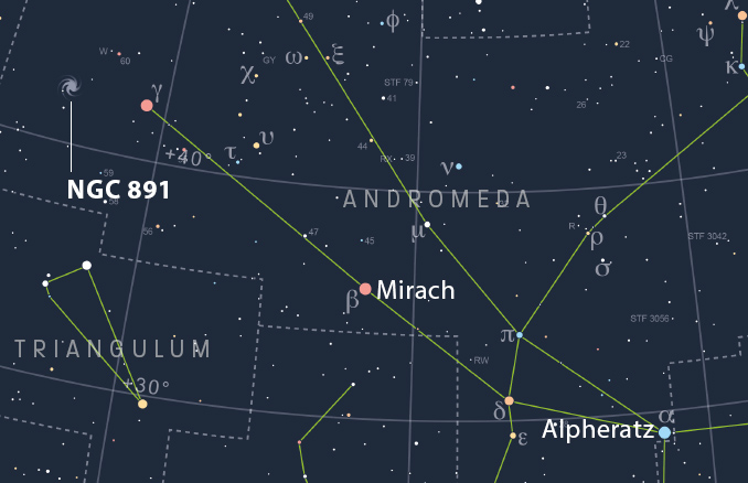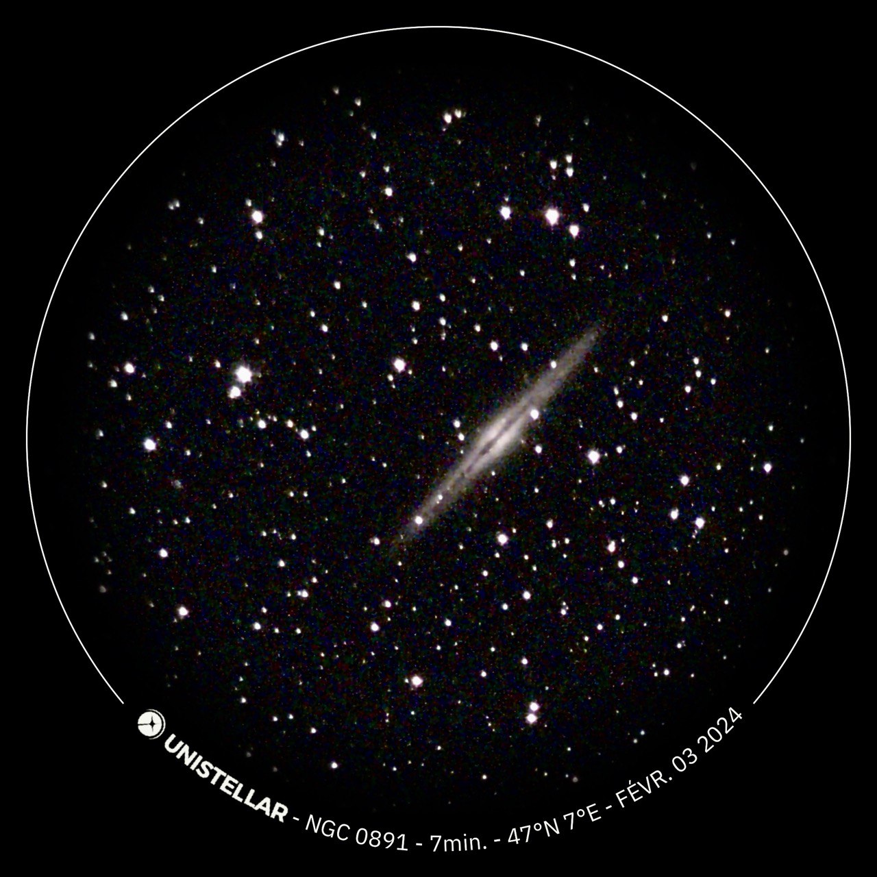 NGC 891 est une galaxie spirale (type Sb) similaire à la nôtre qui a été découverte par Caroline Herschel en août 1783. Selon une étude menée en 1991), une distance d'environ 30 millions d'années-lumière séparerait NGC 891 de notre Galaxie. Vue depuis la Terre, elle est située dans la constellation d'Andromède, cette galaxie est le prototype même des galaxies vues par la tranche, et le plan médian est ici traversé par une épaisse bande de poussières qui semble fendre la galaxie en deux parties symétriques.
