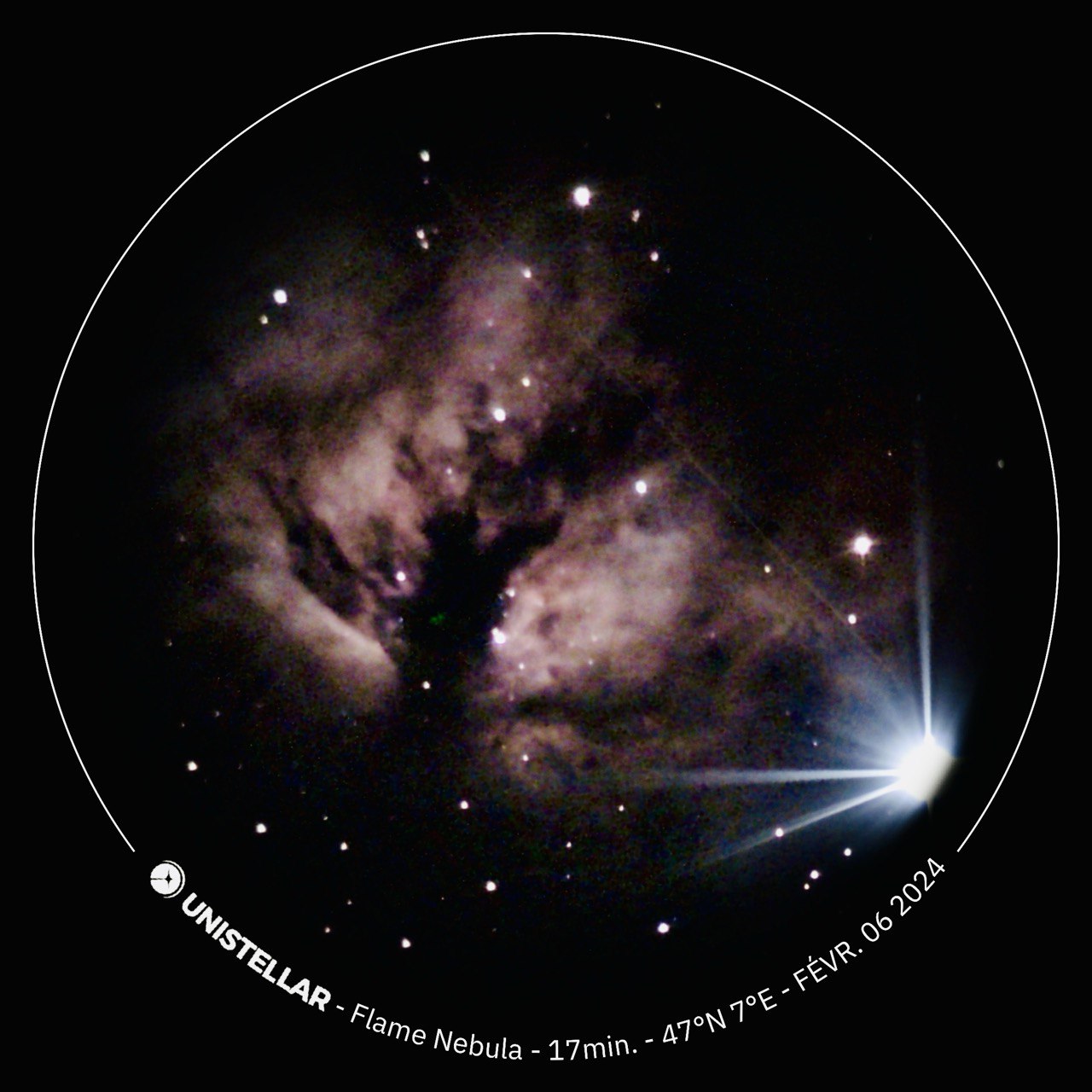 A environ 1400 années-lumière, la nébuleuse de la Flamme, gigantesque nuage de gaz, s'étend sur environ 12 années-lumière.